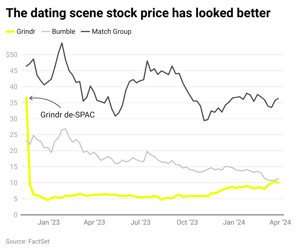 After a mostly terrible ride on the stock market — during which its price dropped more than 70 percent — Grindr finally got some love. TD Cowen gave the dating app company its first buy rating since its de-SPAC in November 2022. Its stock jumped on the news — nearly putting it in territory of its struggling dating app peers. Cowen’s analyst, however, thinks there’s more to love about Grindr than other dating apps: “Grindr’s social dating app targets a global LGBTQ+ demographic which is growing faster than the overall population.”