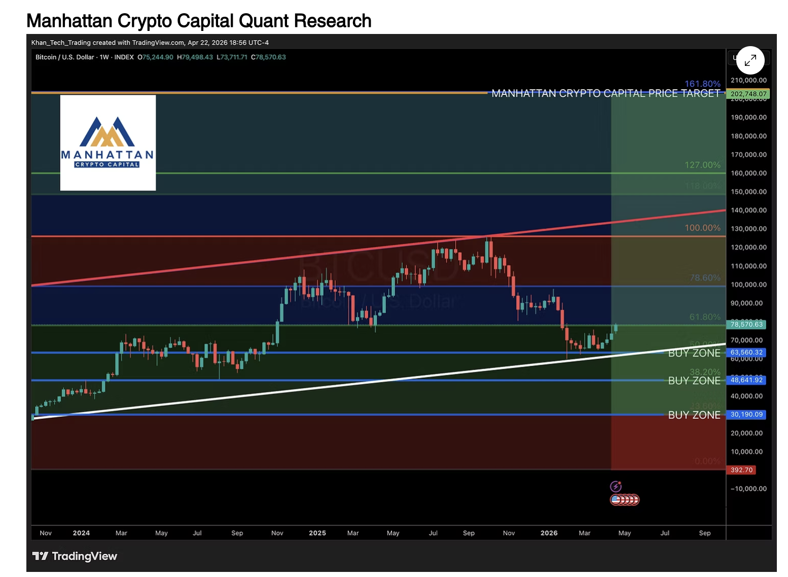 Khan is watching for a weekly close above the downtrend line from $126,000, with an expanding range, which could open the path to $202,748.