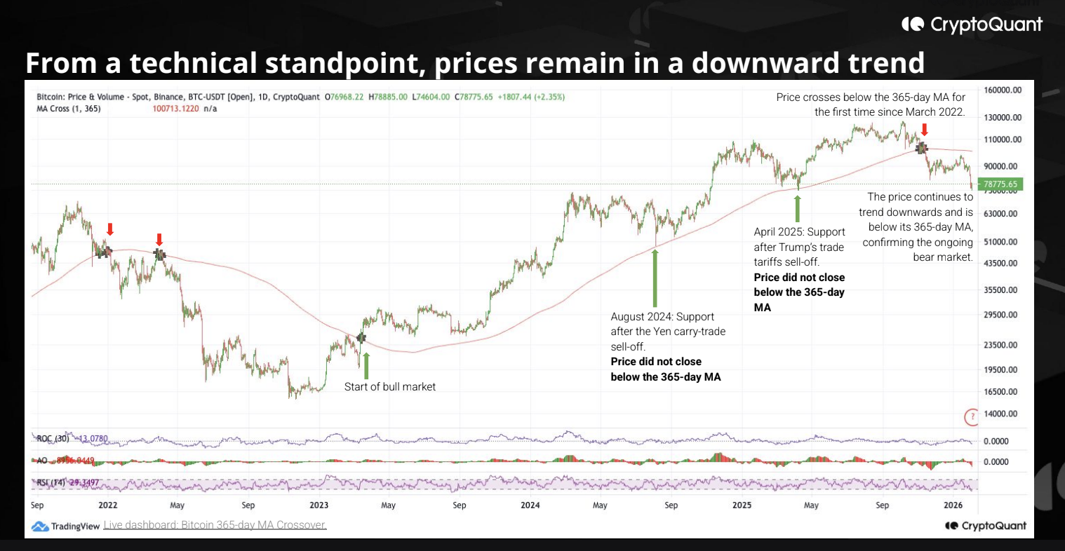 A new CryptoQuant report shows that on-chain indicators confirm a bear market regime, one worse than in 2022, with institutional demand reversing, spot demand remaining weak, and liquidity conditions tightening.