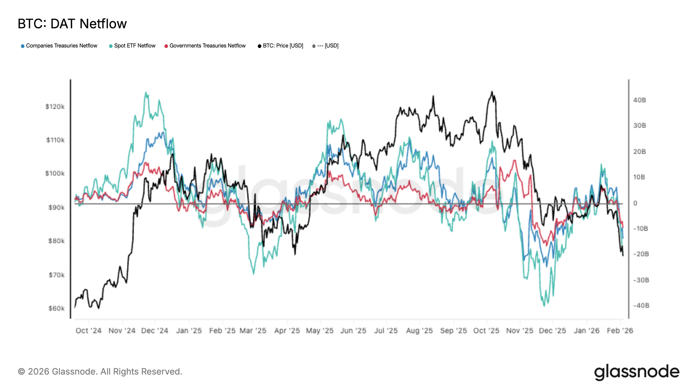 A February 4 Glassnode report, “Bears in Control,” notes that “spot BTC volumes remain structurally weak, with the 30D average still depressed despite BTC rolling over from $98K to $72K. This reflects a demand vacuum, where sell-side pressure isn’t being met by sustained absorption.”