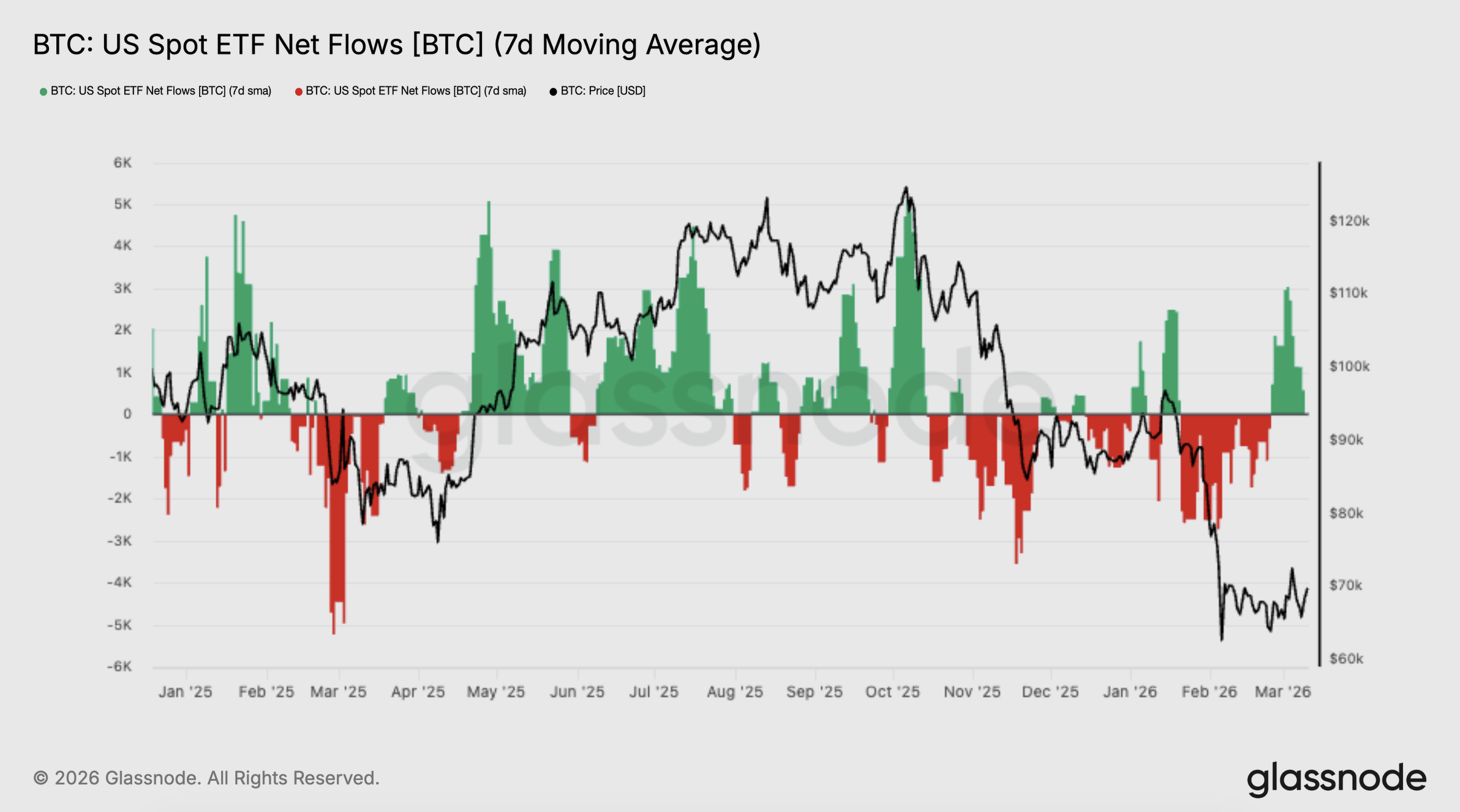 Over the past week, inflows have pushed the “7-day average firmly back into positive territory,” marking “the most significant demand impulse since the correction began, suggesting institutional buyers may be stepping in as bitcoin stabilizes near recent lows,” Glassnode analysts said in a report.