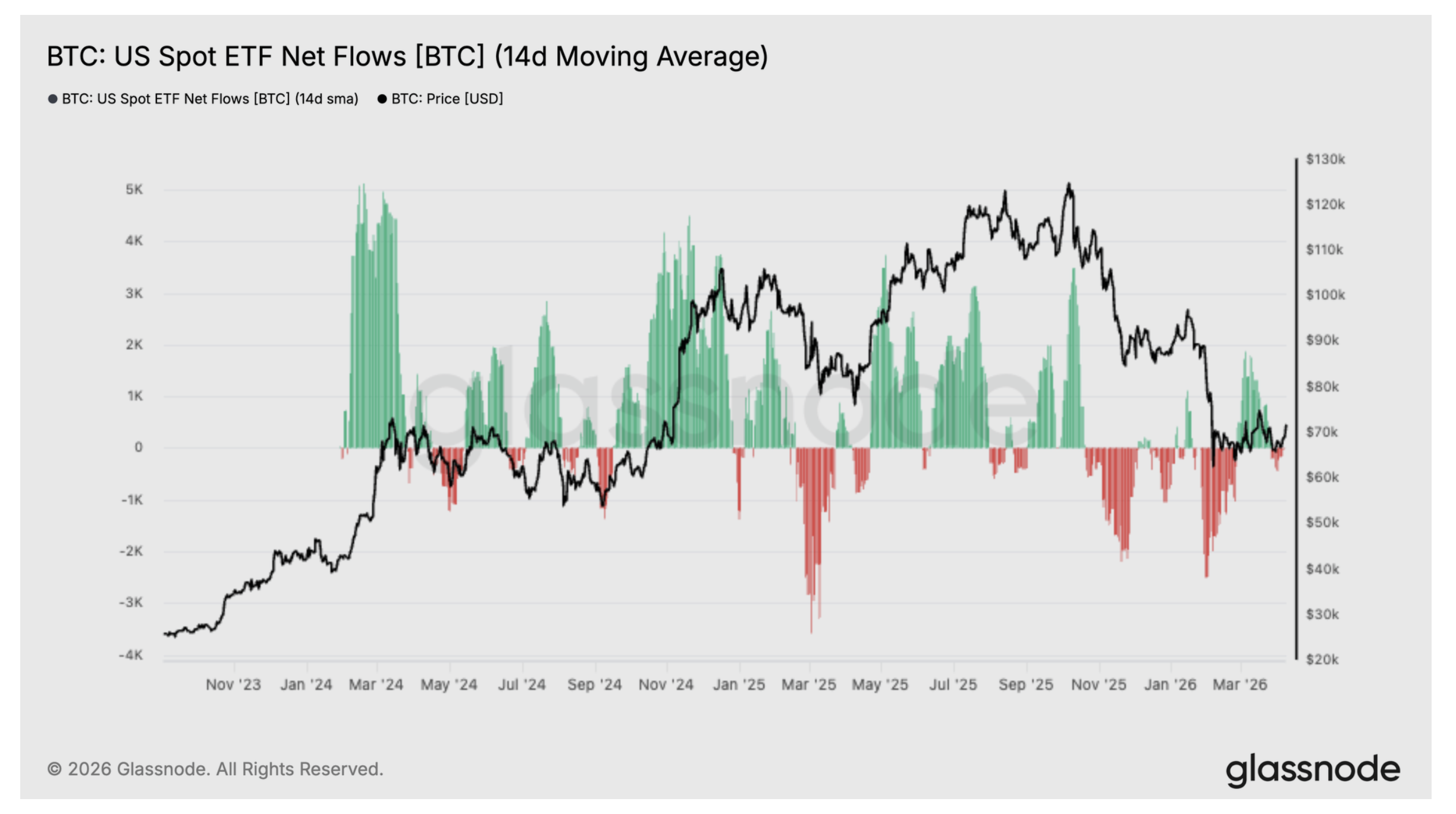 Glassnode echoed the sentiment, saying in a report that ETF flows are starting to improve, “with the 14-day average flipping back into modest net inflows after an extended period of outflows.”