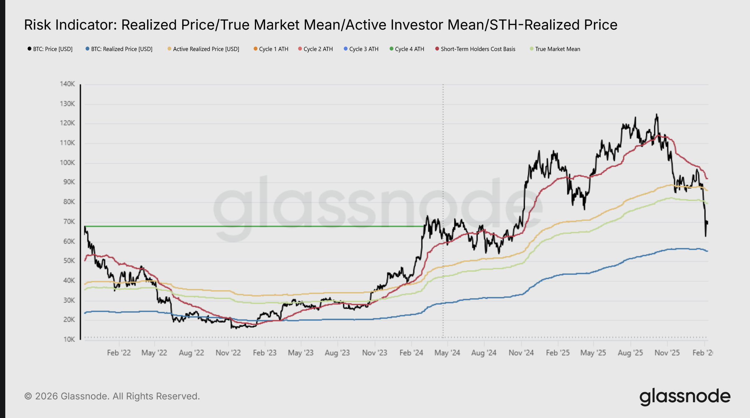 “A meaningful regime shift, in the short-term, would likely require an out-of-ordinary catalyst, either a decisive reclaim of the True Market Mean near $79.2k, signaling renewed structural strength, or a systemic dislocation similar to LUNA or FTX that forces price below the Realized Price around $55k. In the absence of such extremes, a prolonged phase of range-bound absorption remains the most probable path for the mid-term market,” Glassnode wrote in the February 11 report.