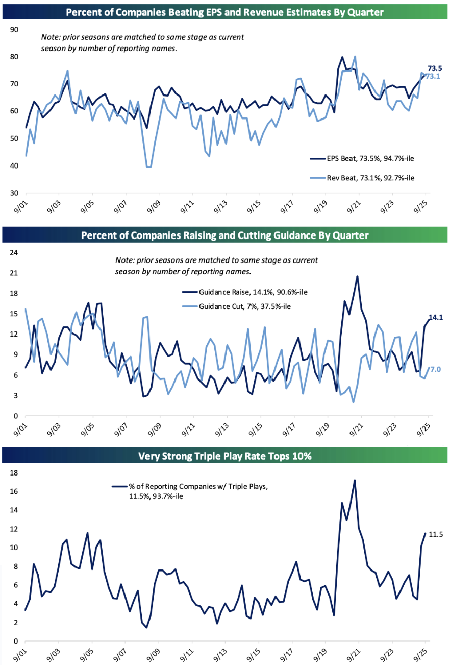 Bespoke Investment Group has an excellent series of charts spotlighting just how positive this third-quarter corporate reporting period has been, with exceptional beat rates and guidance hikes across US stocks: