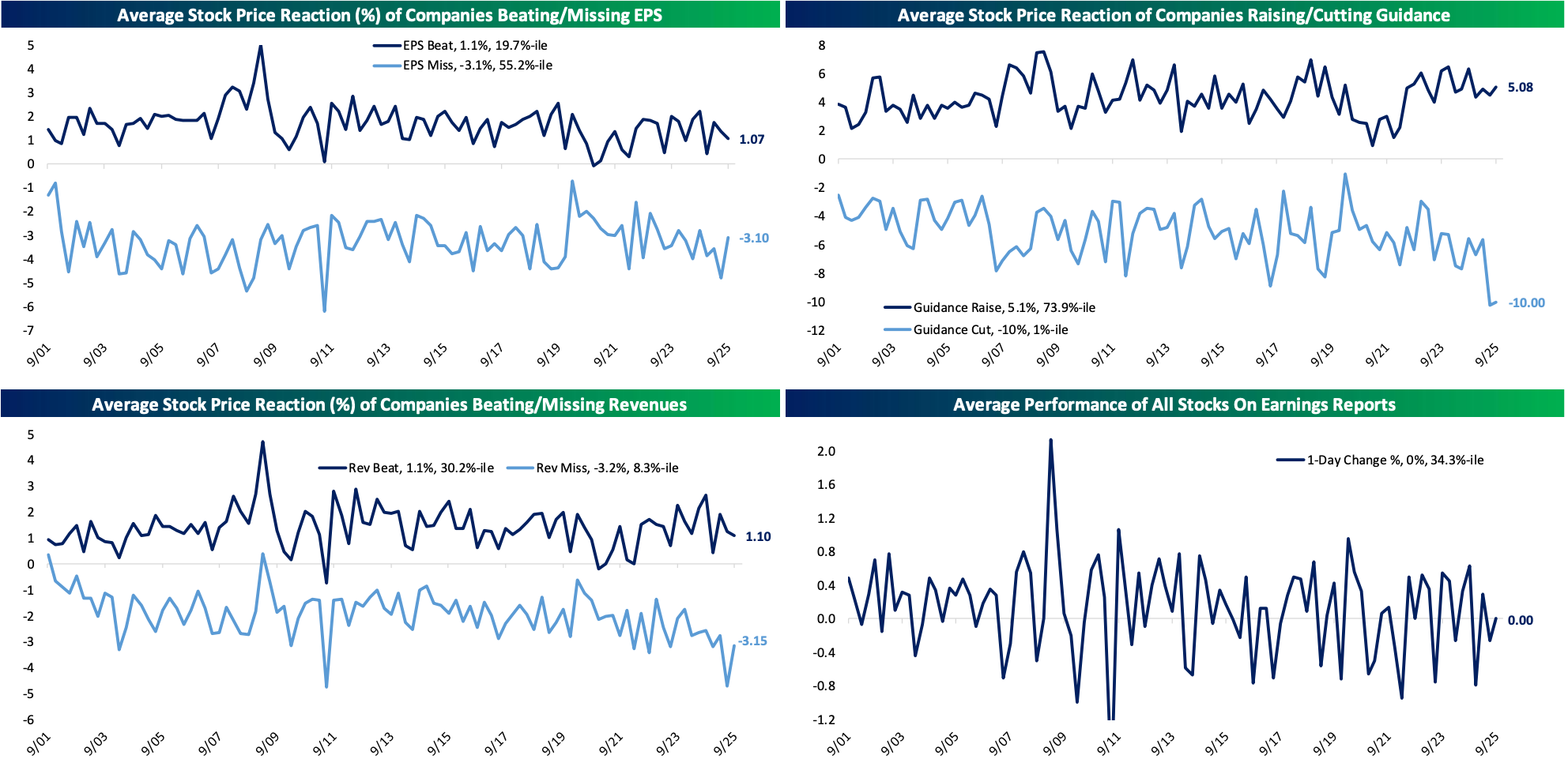 However, despite 73.5% of companies tracked by Bespoke beating on earnings per share this quarter, the analysts noted that earnings reactions have “been a completely different story.”