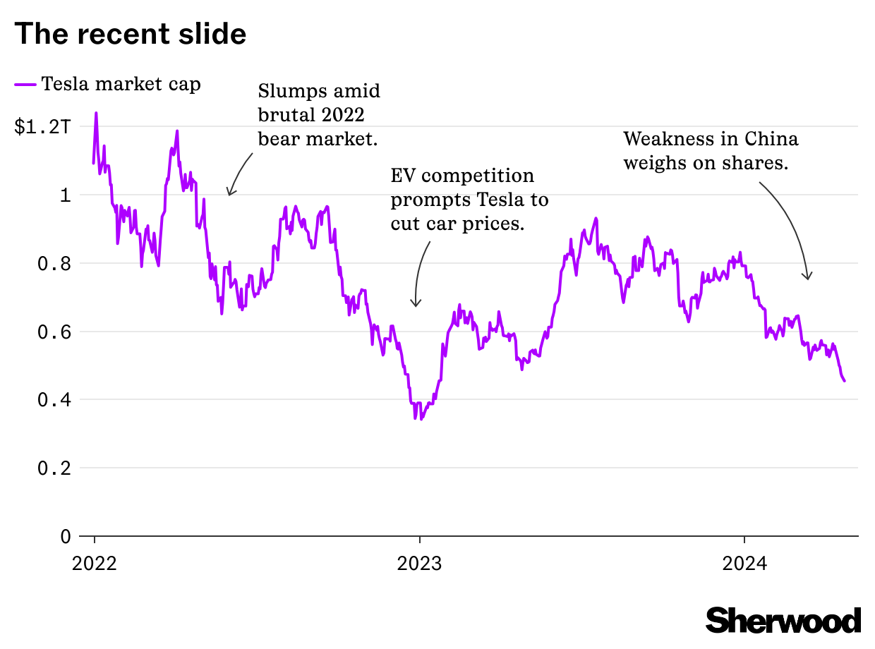 On the other hand, Tesla shares are down nearly 60% since their all-time peak. The company has ceded ground in EVs, prompting a series of profit crushing price cuts to preserve market share. The cumulative loss in market value over that period is pushing $800 billion. Few corporate executives have presided over such a degree of value destruction.