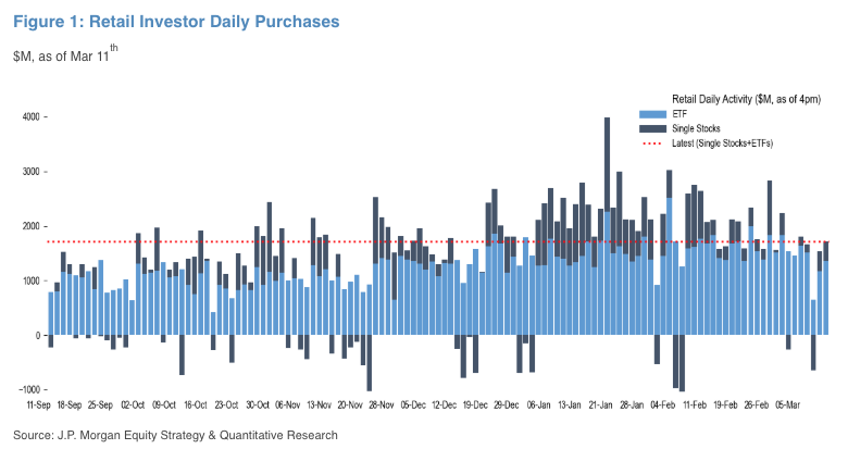 “For the first time this year, retail investors are showing persistent signs of weakness, with weekly purchases decelerating by ~30% after defying seasonal patterns and making February their 3rd largest month on record,” wrote JPMorgan strategist Arun Jain. “In fact, Monday marked the largest net-selling day in single stocks in a month, before purchases resumed at a positive, yet below YTD average pace on Tuesday and Wednesday.”