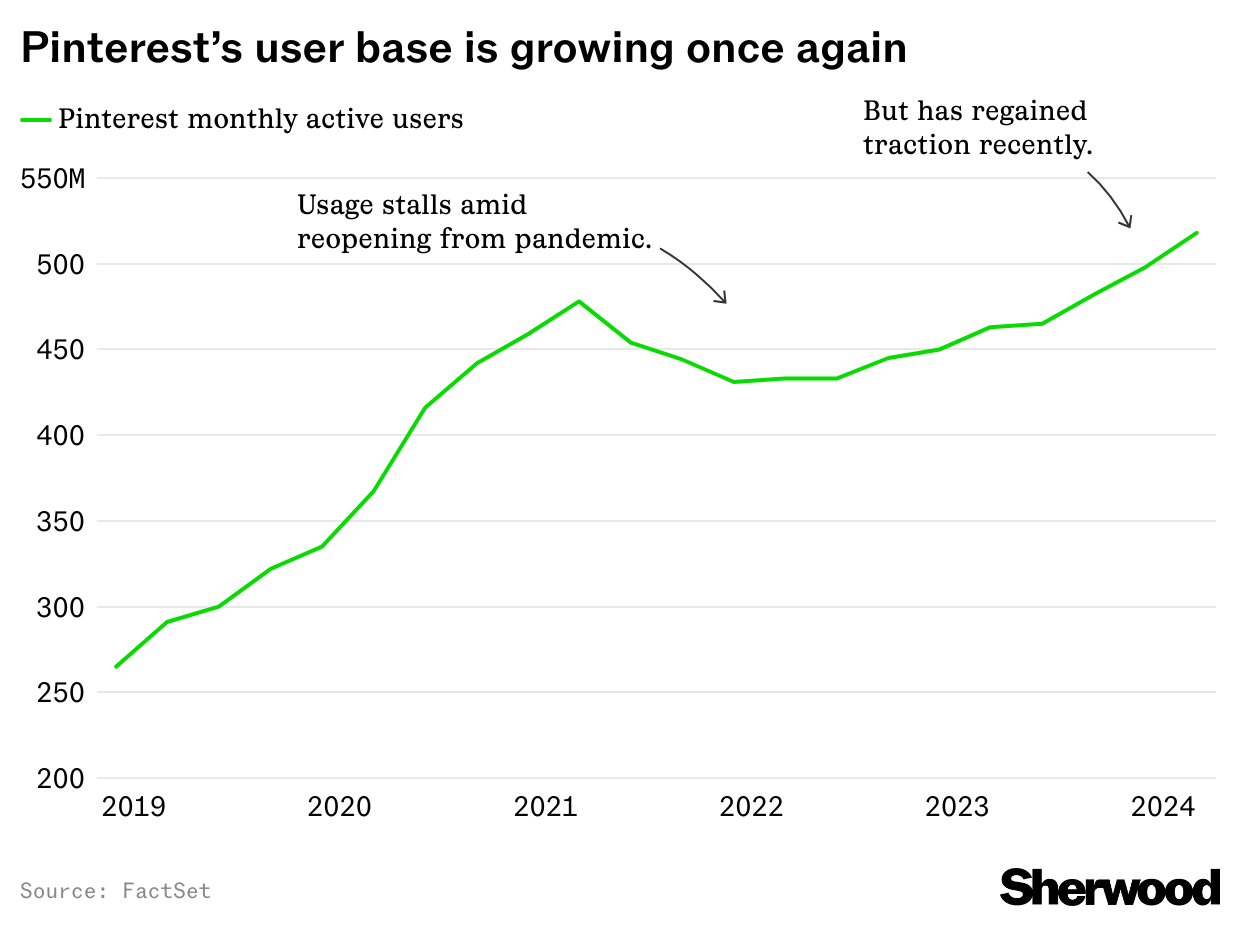 Q1 sales jumped 22.8%, the fastest since 2021. Monthly active users hit a record 518 million. The company still lost money, though it narrowed to its loss to $24 million, from $209 million during the first quarter last year.
