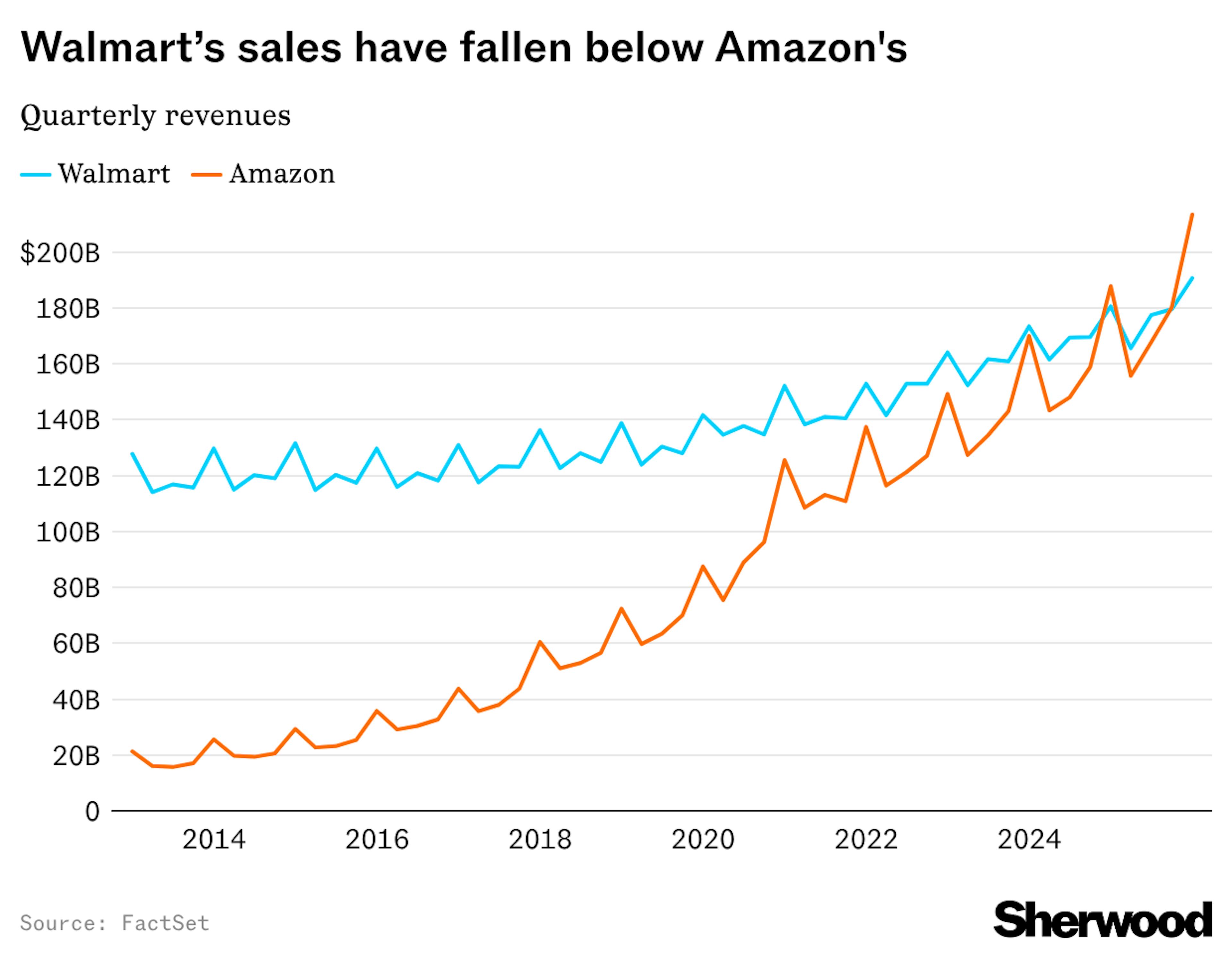 The other big takeaway from earnings was that Walmart reported revenue of $713.2 billion for the full year, just below Amazon’s $716.9 billion, making it the first time the Bentonville-based retailer has trailed its online-native rival on annual sales.