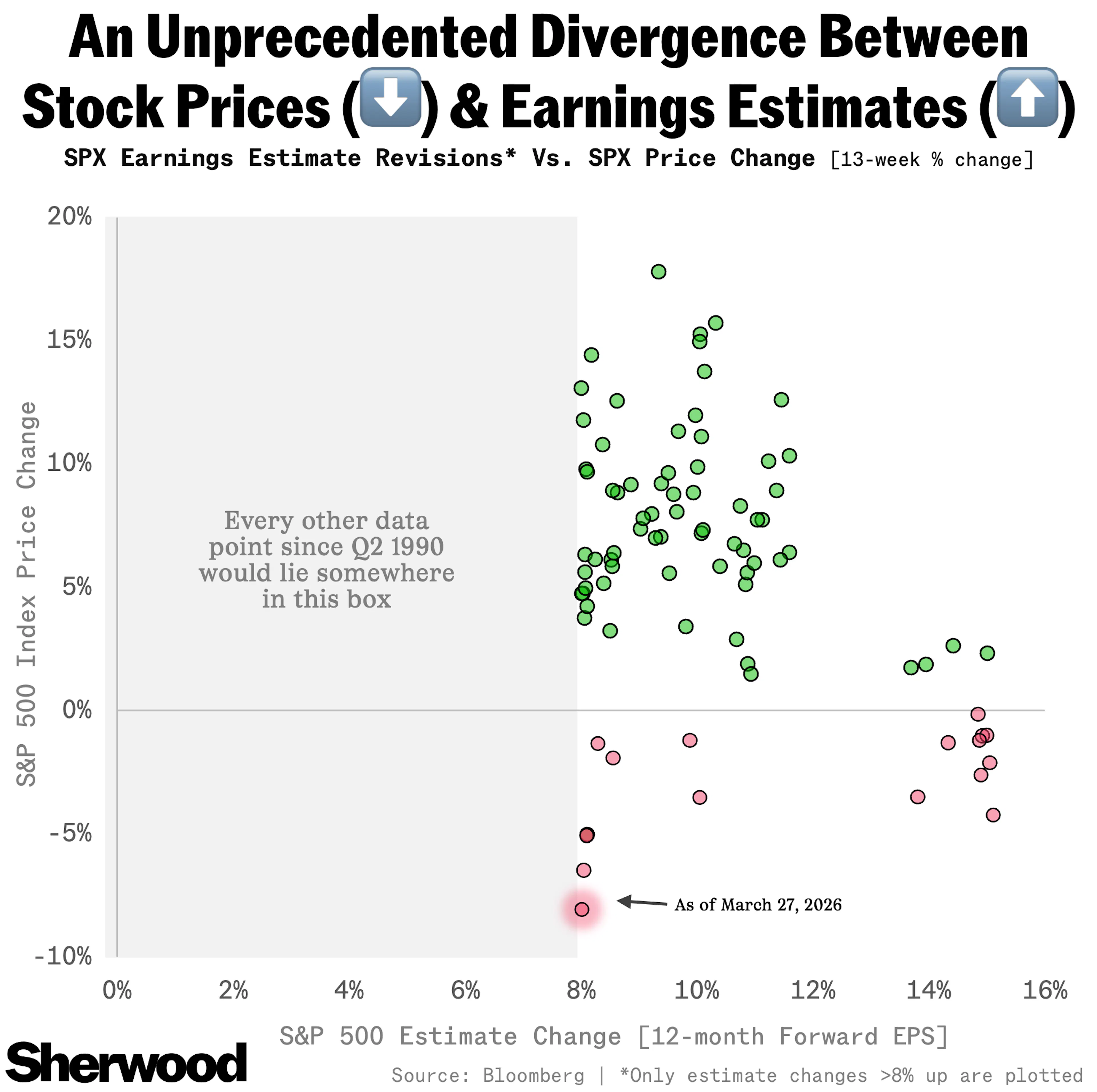 Stocks have never been down this much when earnings estimates have risen by this much, based on data going back to Q2 1990.