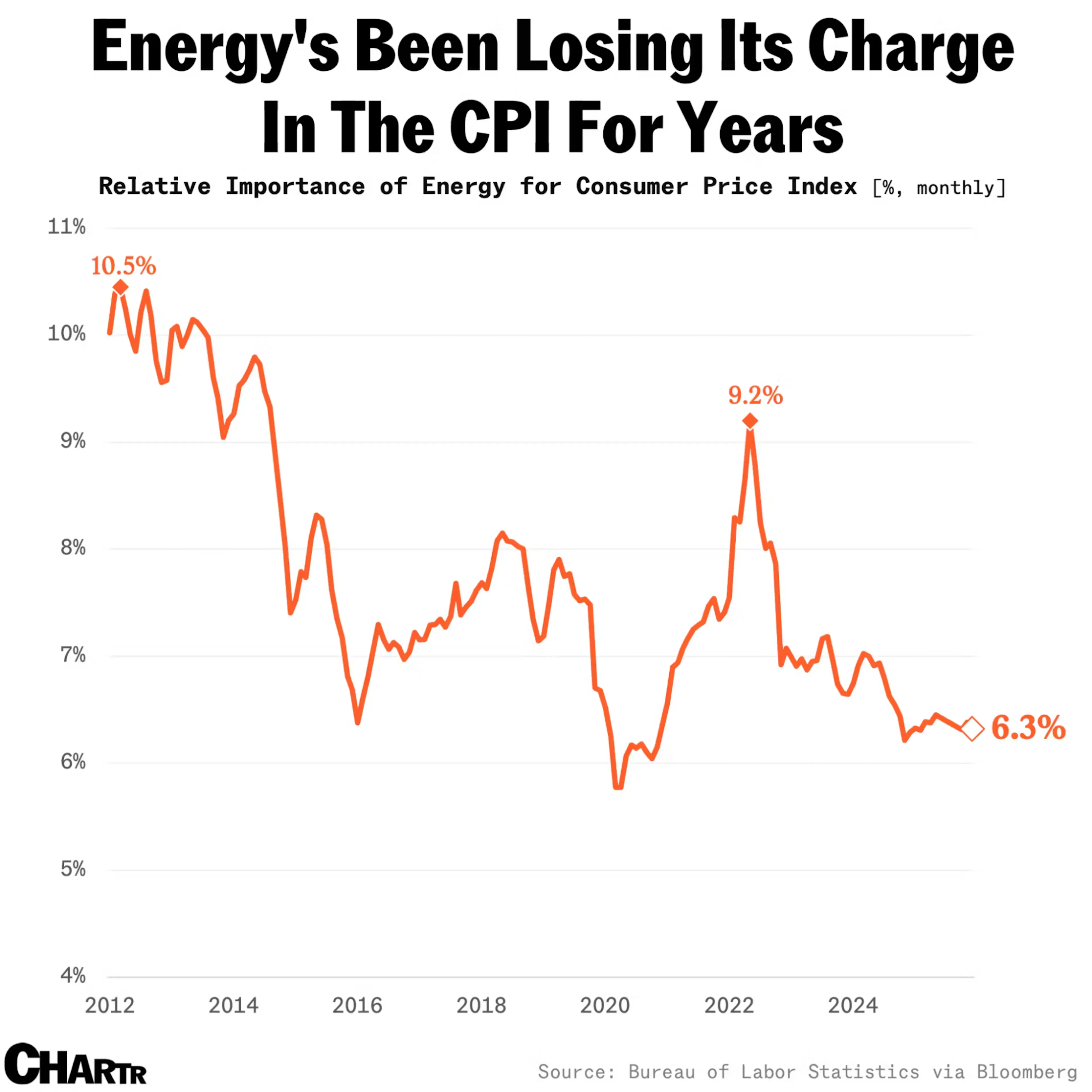 That is significantly lower than it was back in 2012, when energy was more than 10% of the index — and, of course, when prices spike, people have to spend more on those goods, which is why the weight of energy in the CPI basket jumped after Covid in 2022.