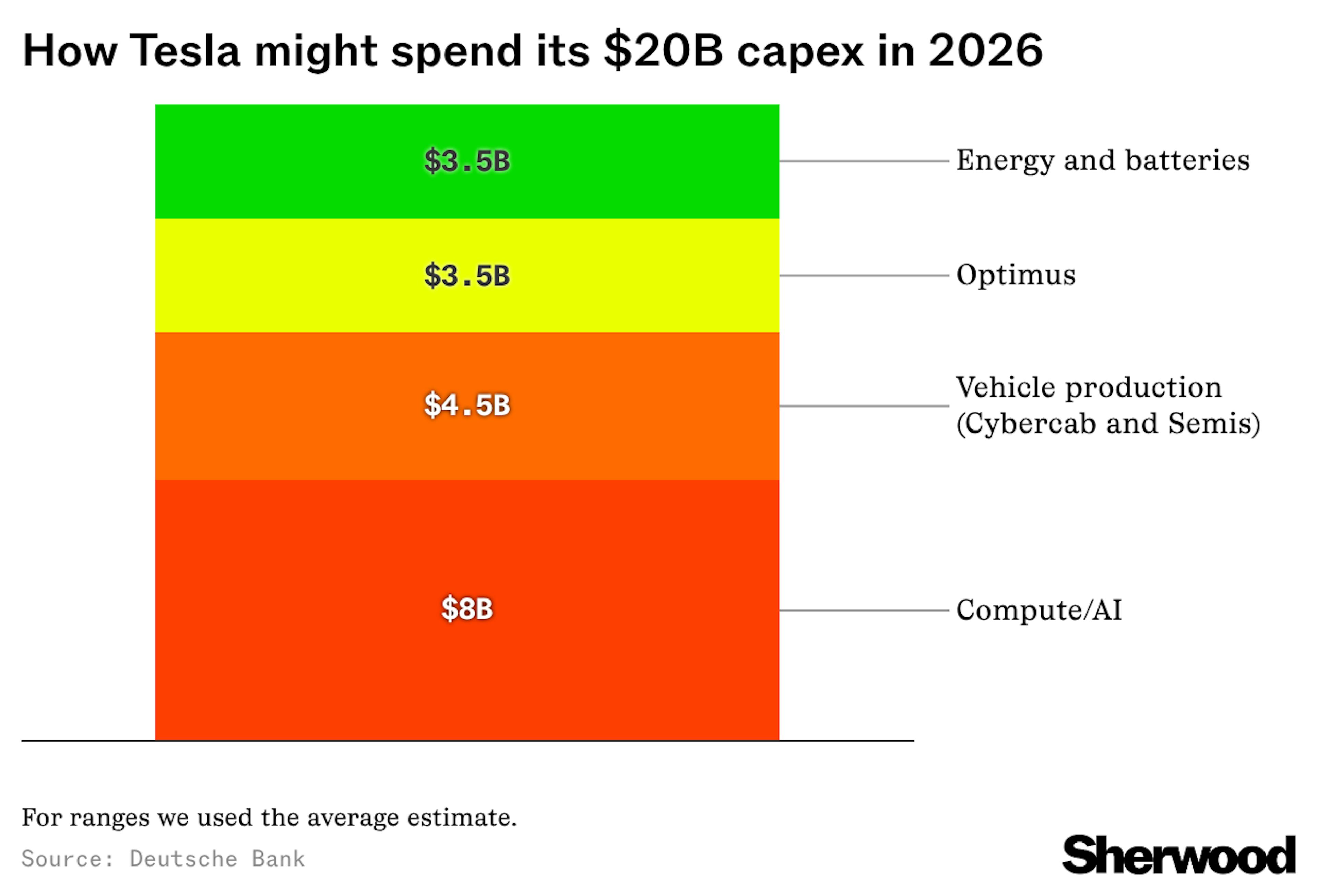 Tesla’s going to outlay over $20 billion, specifically on “six factories, namely the refinery, LFP factories, Cybercab, Semi, a new Megafactory, the Optimus factory.” According to Deutsche Bank, about $8 billion is going to compute, $4.5 billion to vehicles, $3.5 billion to Optimus, and $3.5 billion for batteries and energy.