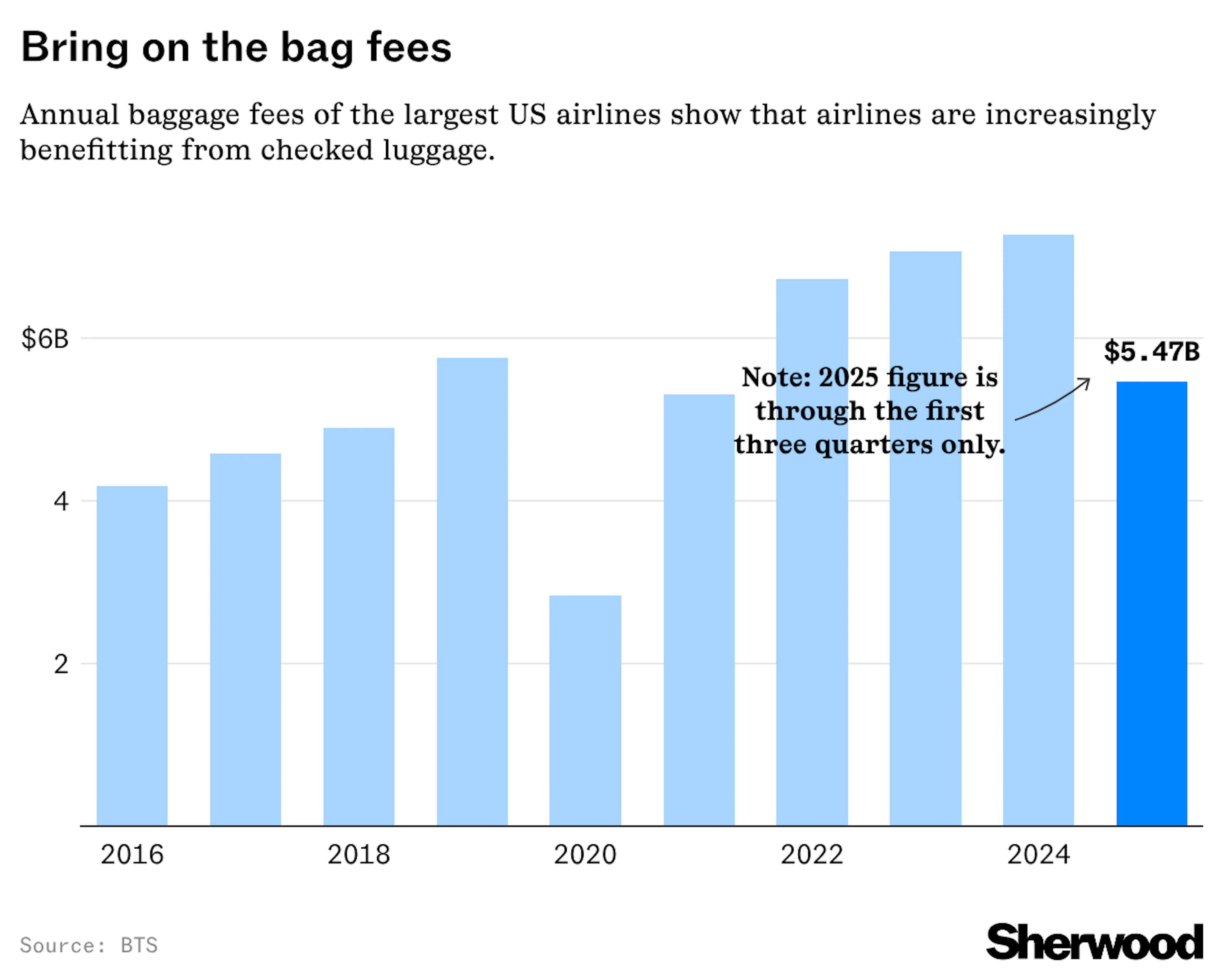 Bag fees are benefiting the aviation industry more every year. Through the first three quarters of 2025, checked luggage charges generated $5.47 billion in revenue for the country’s largest airlines — up about 12% from the industry’s full-year total in 2018.