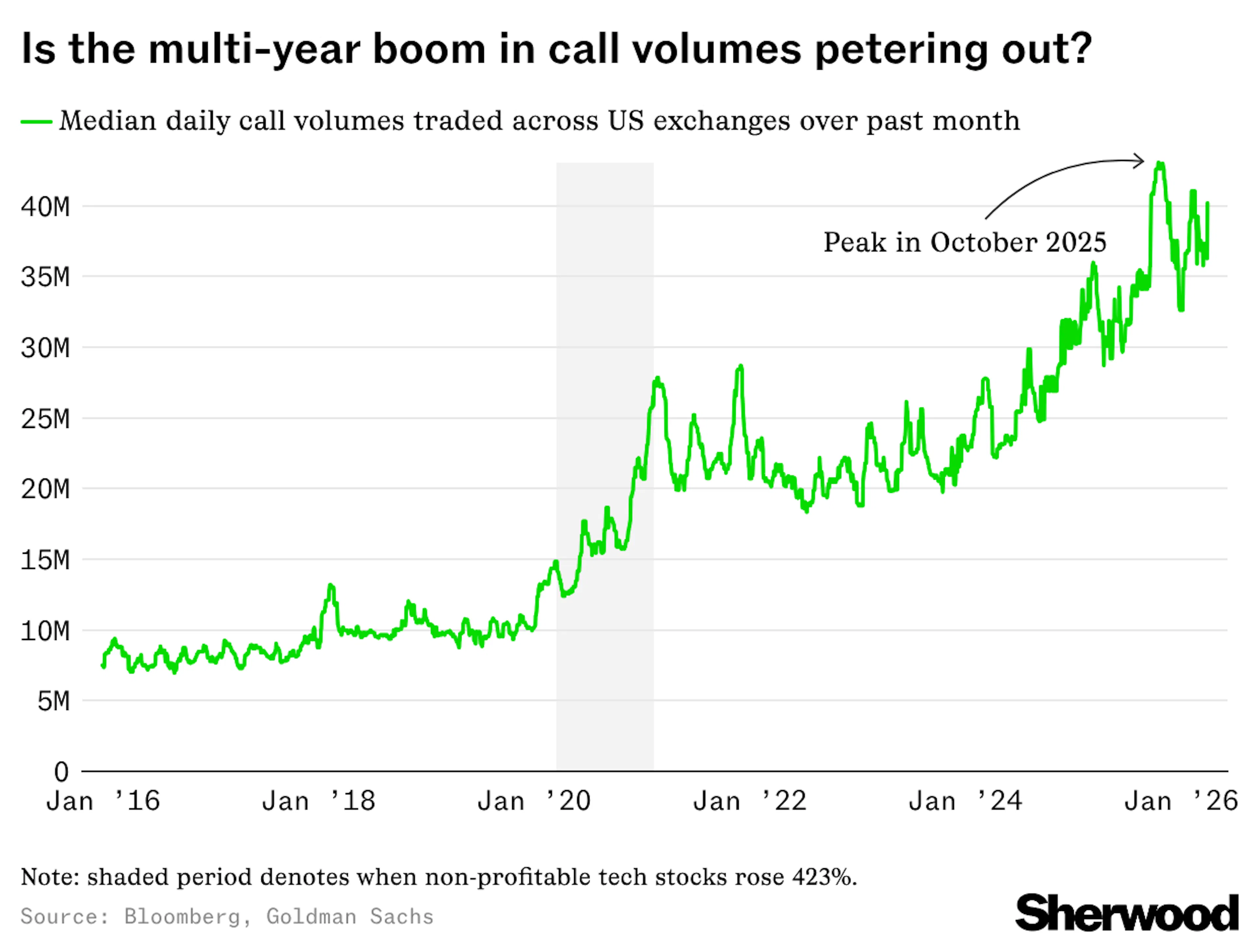 Zooming out, the speculative fever that dominated price action for much of 2025 looks to have broken. Call volumes traded across US exchanges (which we highlighted as a key chart to watch for 2026) peaked in October.Â