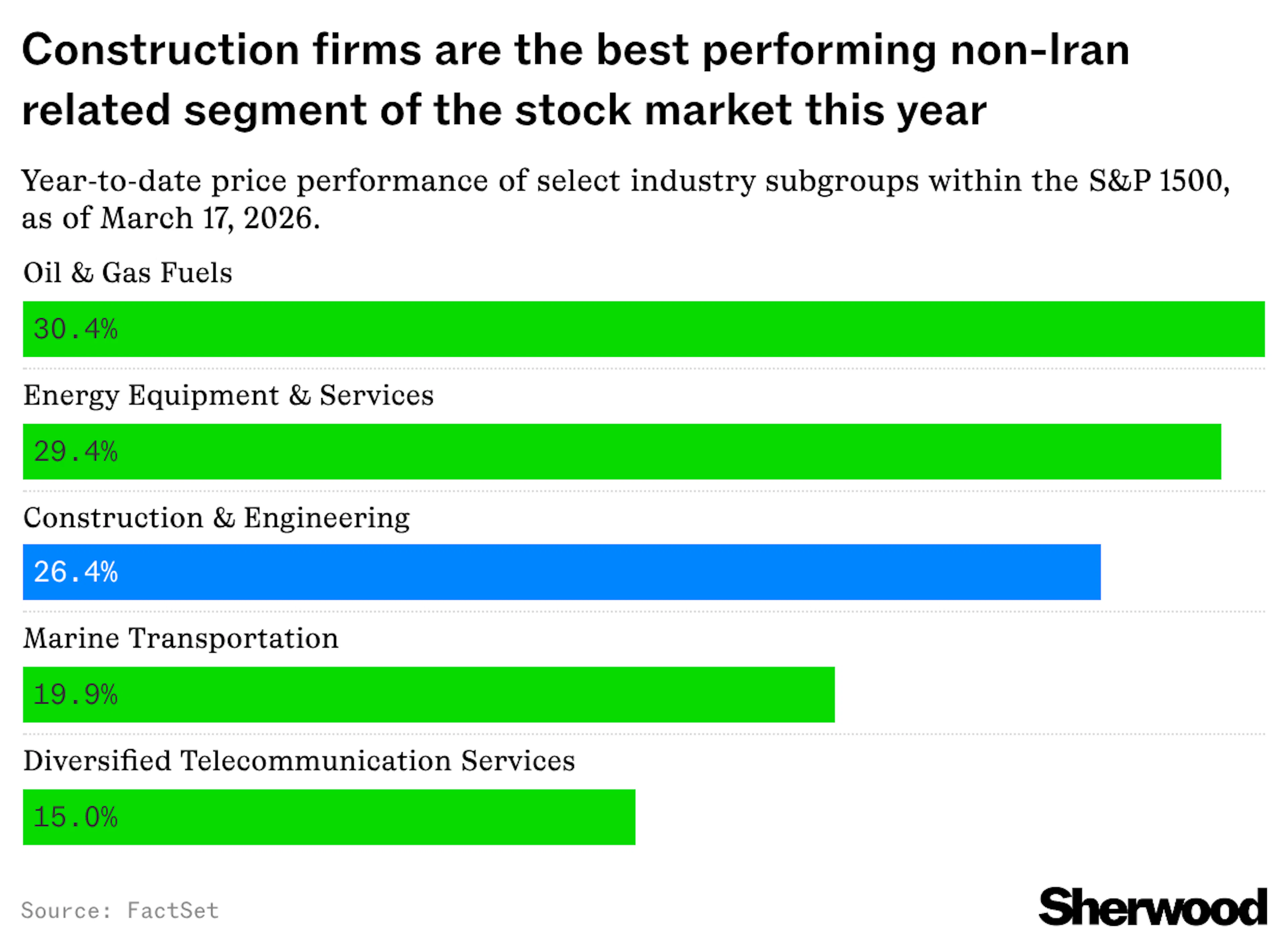 The S&P 1500 construction and engineering sub-index, a group of 16 mid-to-large cap companies, is up more than 25% in 2026 and has more than doubled over the past 12 months. (For comparison, the entire S&P composite 1500 is down slightly this year.)Â Â Â