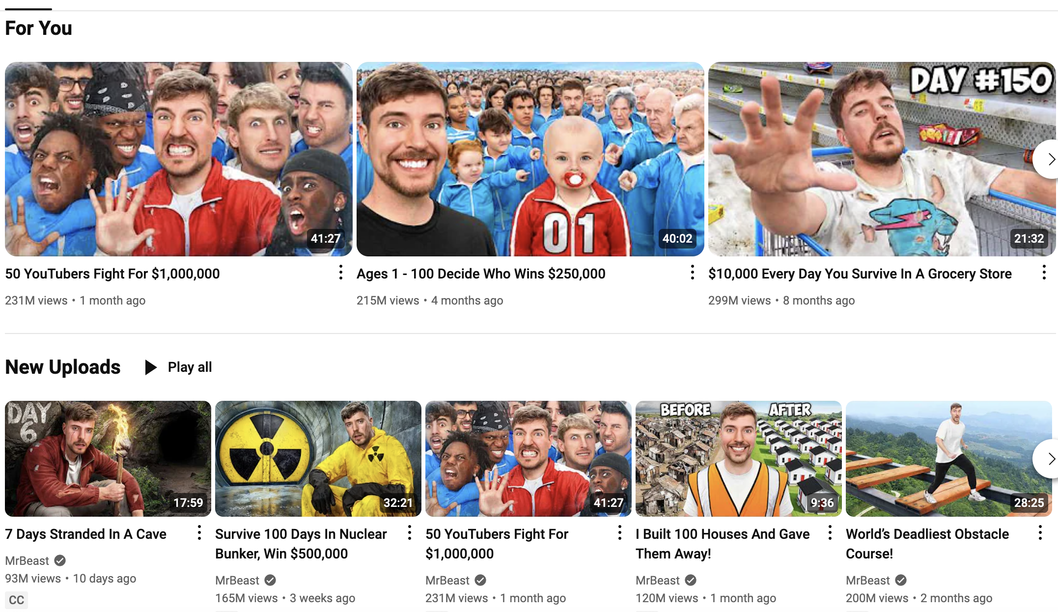 There's also the very real chance that Donaldson is spread too thin, on the brink of overexposure. It’s a lot to create YouTube content at his usual rate of two full-length videos a month, plus daily Shorts to repost to Instagram Reels and TikTok, while producing an Amazon show. And while it may be true that Donaldson has had bad press and clearly has a lot on his plate, if you read the little he has said about his output this year, it seems much more likely that he’s simply reached the peak of what you can do on YouTube.