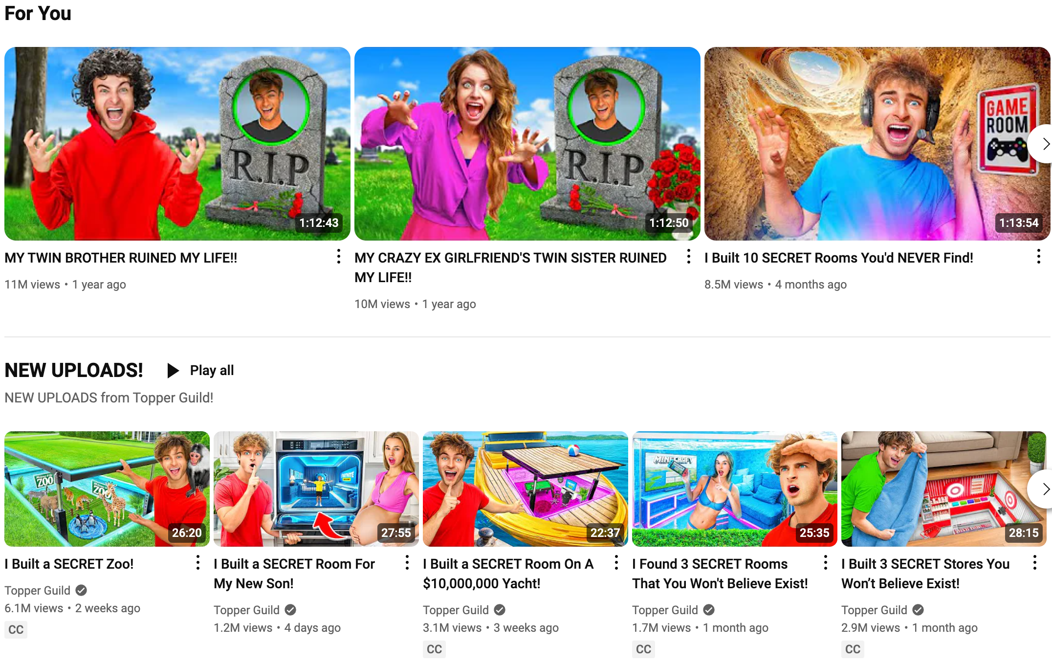 The last MrBeastian YouTuber worth mentioning — one who also had a great July — is Topper Guild, who found wider attention on TikTok in 2021 and has been aping Donaldson's style since 2022. Thanks to his meticulous recreations of MrBeast videos, Guild’s channel had the fifth-highest number of subscribers in July, growing by 5 million followers.