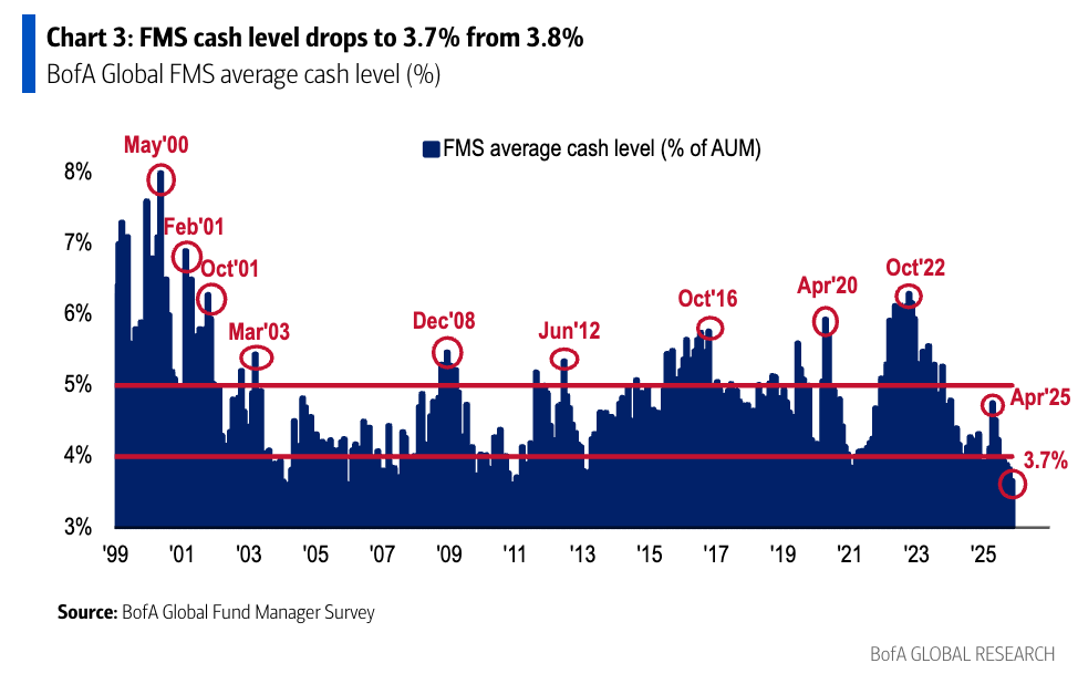 “Note cash levels of 3.7% or lower has occurred 20 times since 2002, and on every occasion stocks fell and Treasuries outperformed in the following 1-3 months,” says Hartnett, who called this low level of dry powder a “sell signal.”