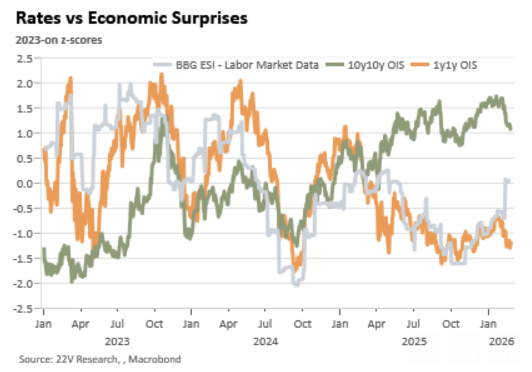 Peter Williams, an economist at 22V Research, wrote that short- and medium-term interest rates have been driven largely by labor market surprises over the past two years, but that this typically strong relationship has recently broken down.